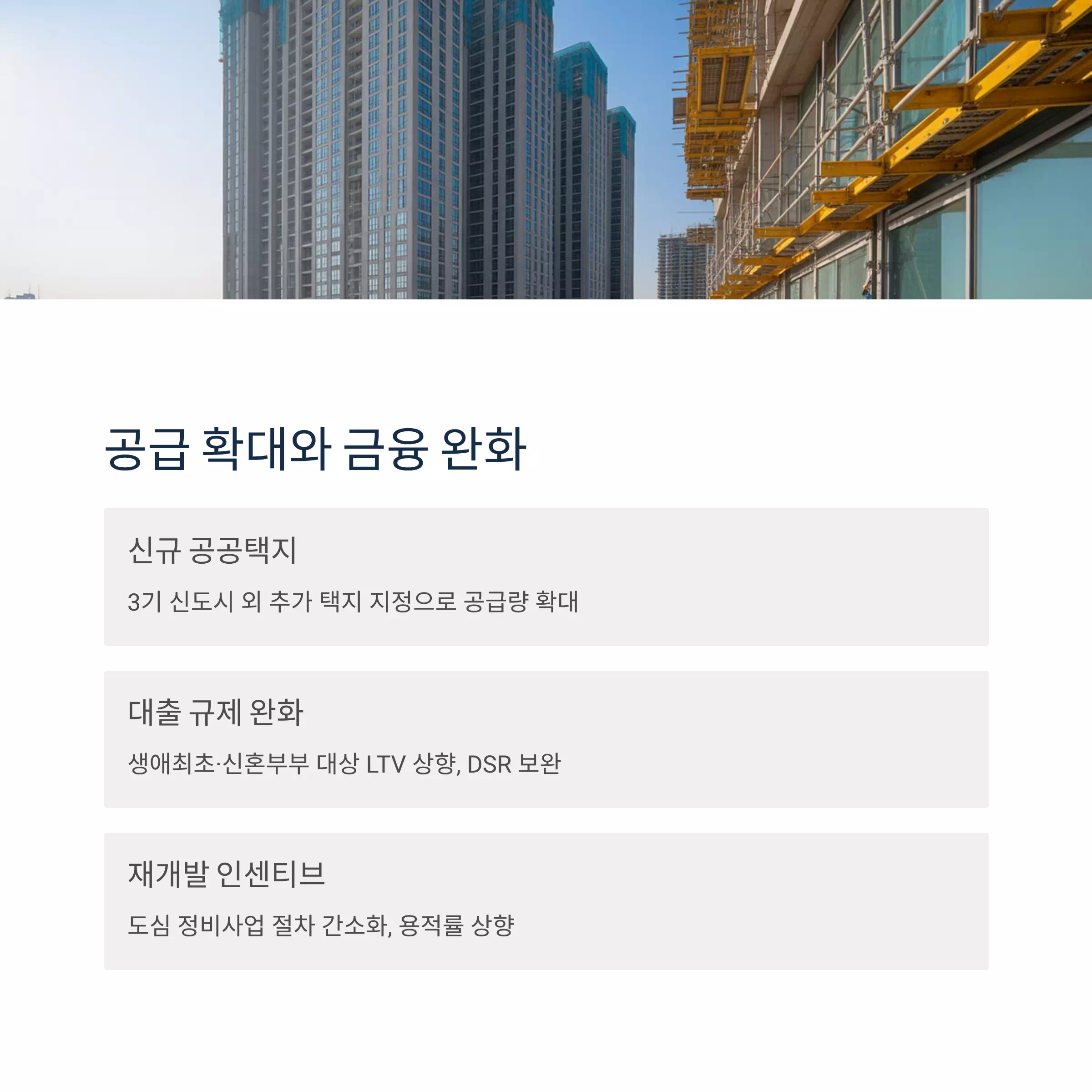 | 공급 확대 | 신규 공공택지, 도심 재개발, 민간공급 활성화 |