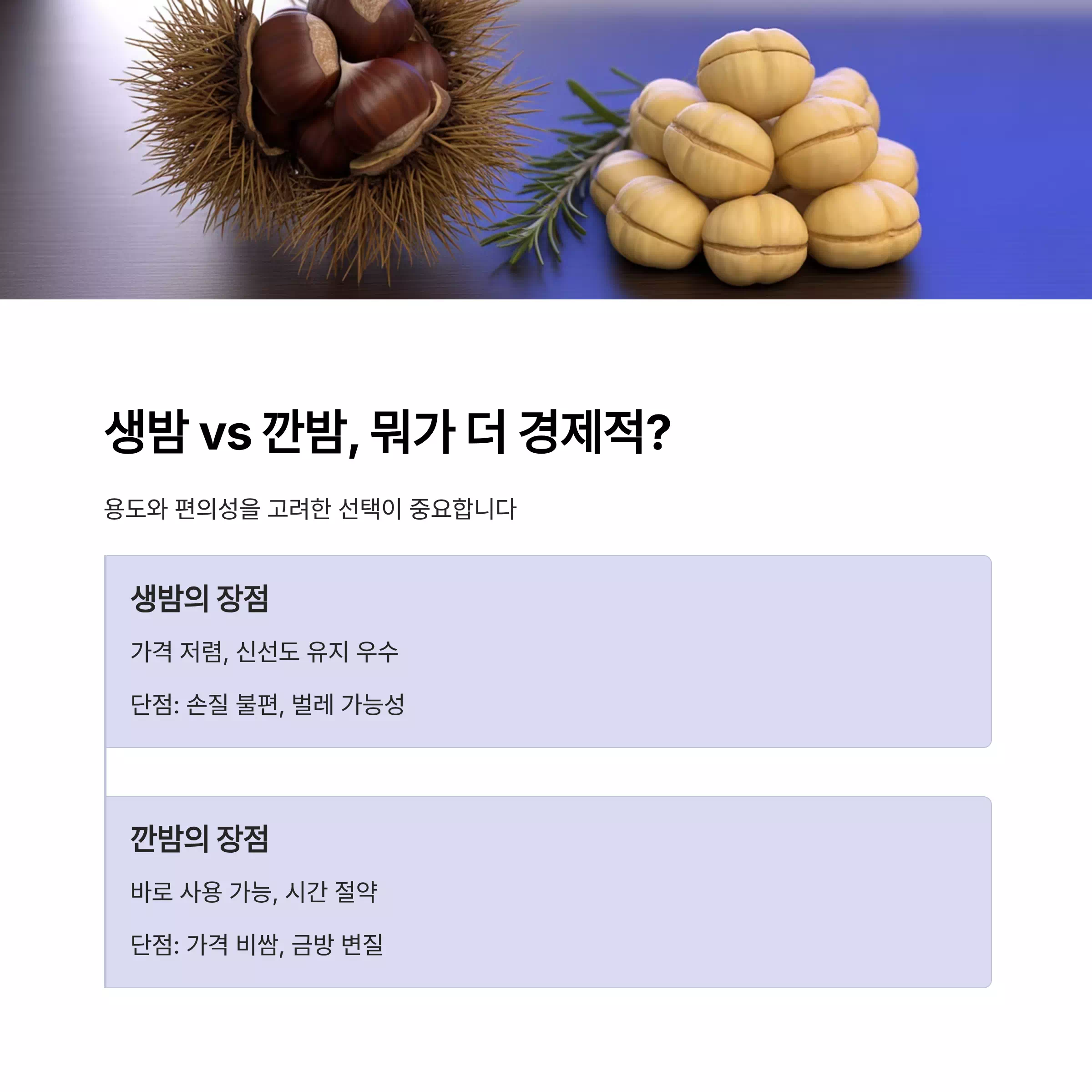 | 깐밤 | 바로 사용 가능, 시간 절약 | 가격 비쌈, 금방 변질됨 |