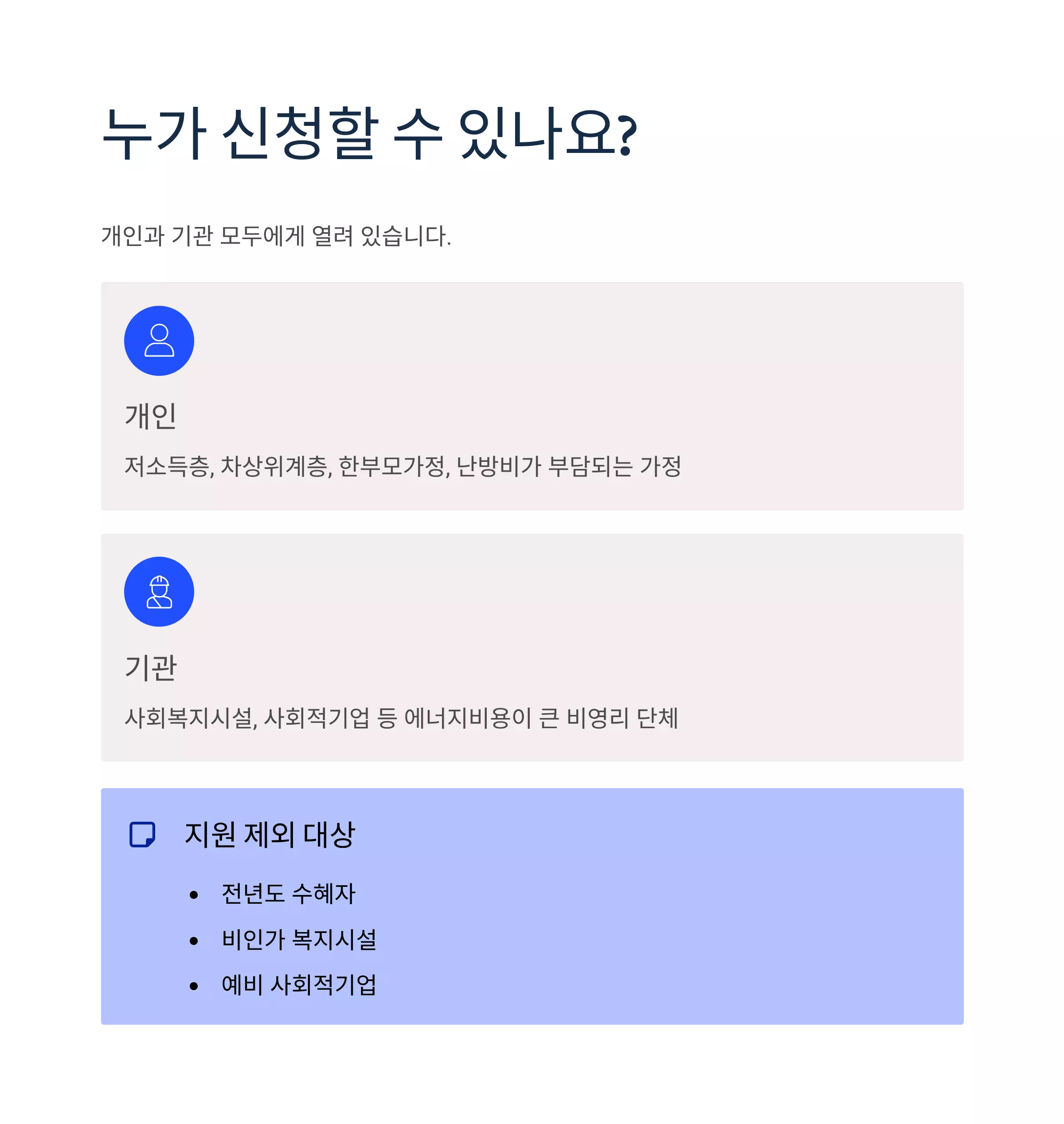 | 개인 | 저소득층, 차상위계층, 한부모가정, 난방비가 부담되는 가정 등 |