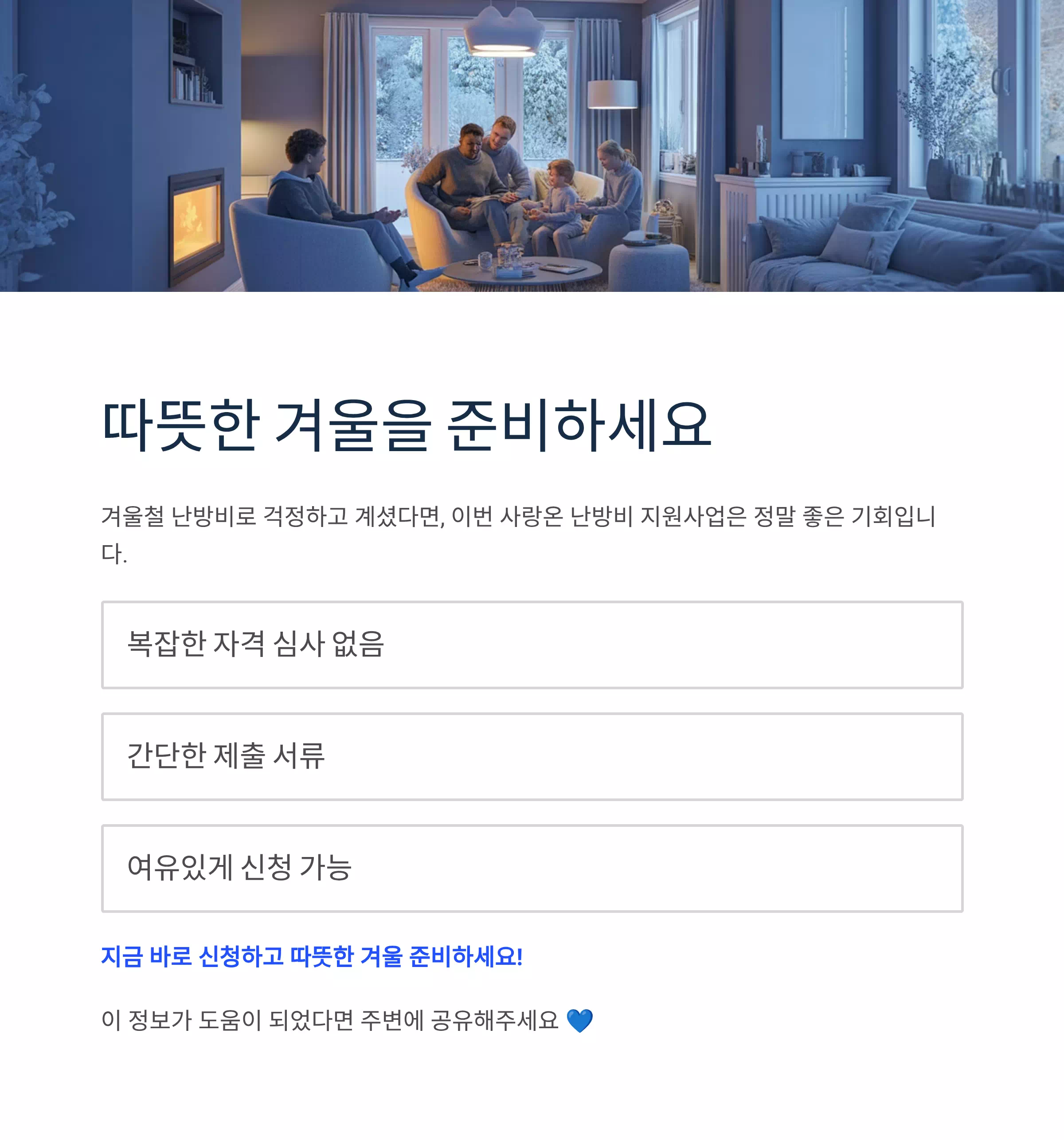 겨울철 난방비로 걱정하고 계셨다면, 이번 사랑온 난방비 지원사업은 정말 좋은 기회입니다.