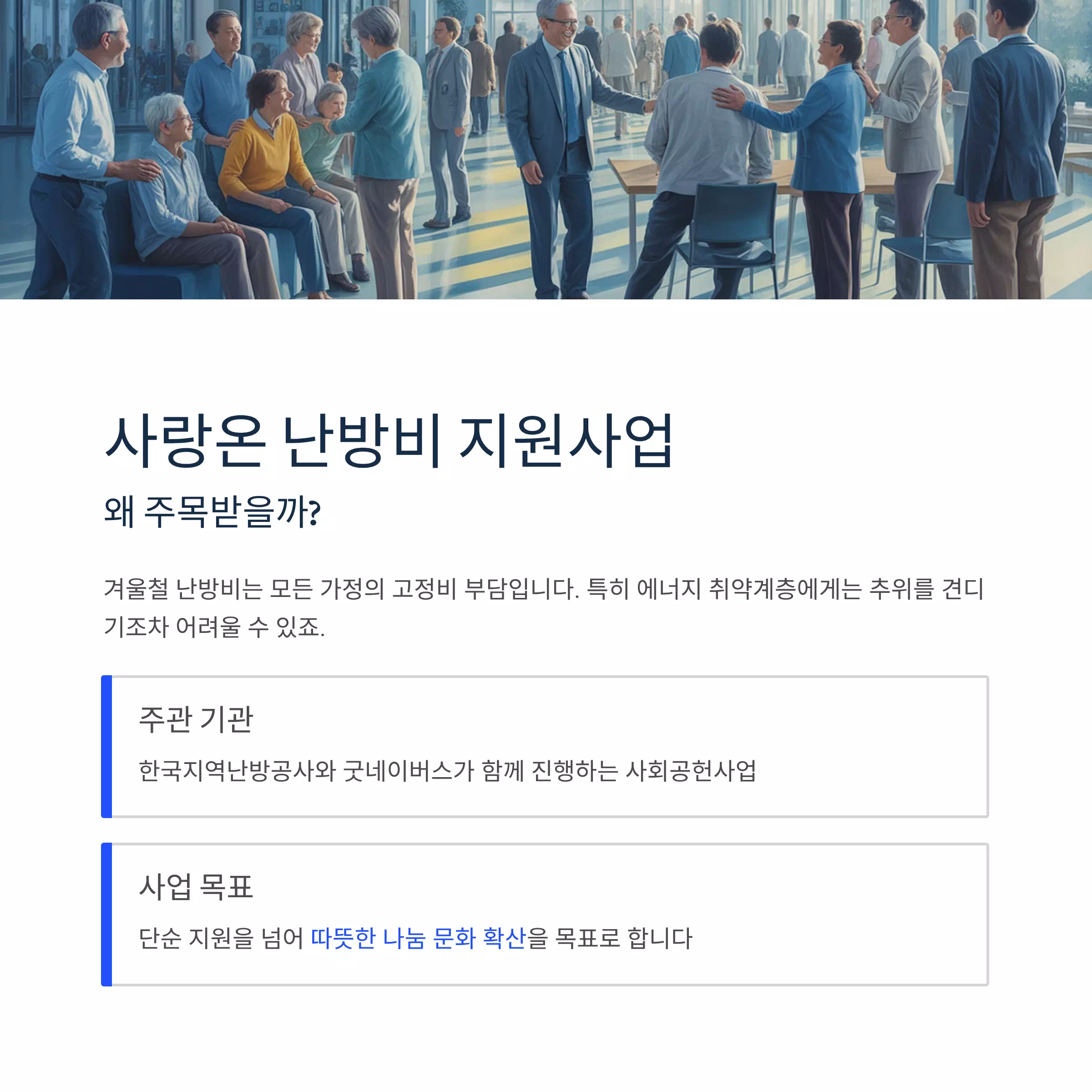 사랑온(溫) 난방비 지원은 한국지역난방공사와 굿네이버스가 함께 진행하는 사회공헌사업으로, 단순 지원을 넘어서 ‘따뜻한 나눔 문화 확산’을 목표로 하고 있어요.