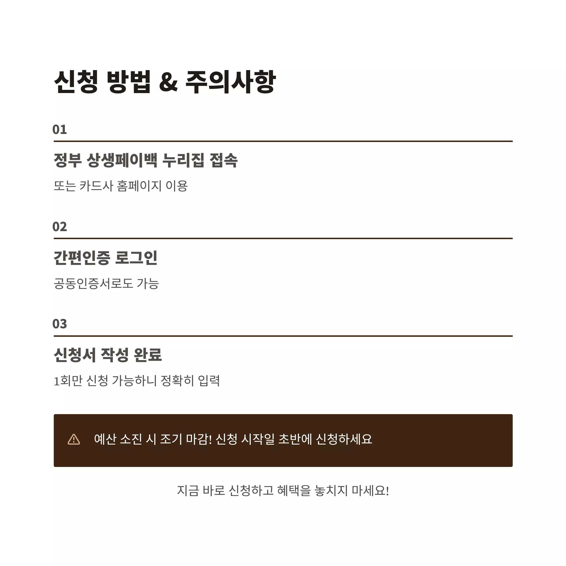 신청은 정부 상생페이백 누리집 또는 카드사 홈페이지에서 가능합니다. 간편 인증이나 공동 인증서를 이용한 로그인 후 신청서를 작성하면 됩니다.