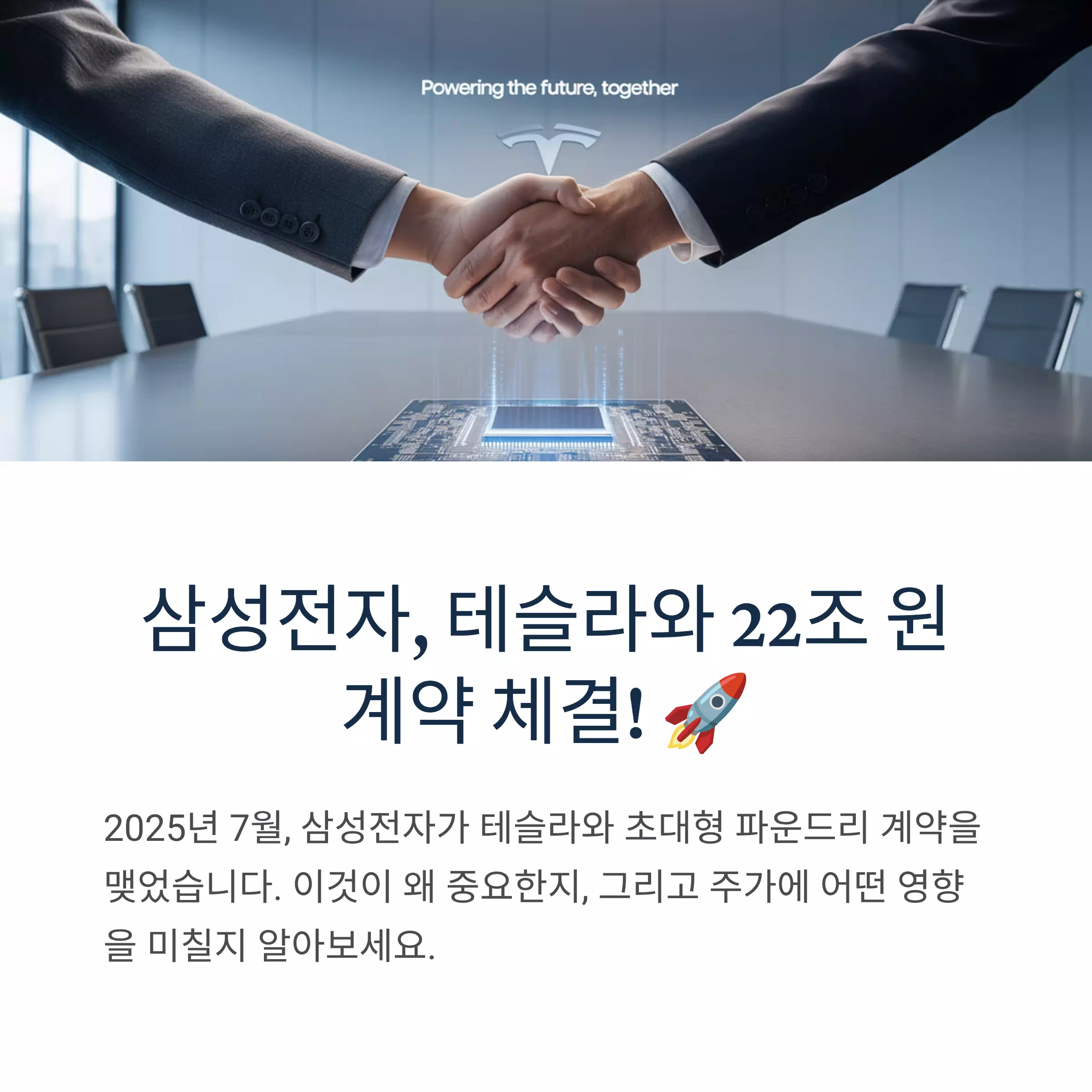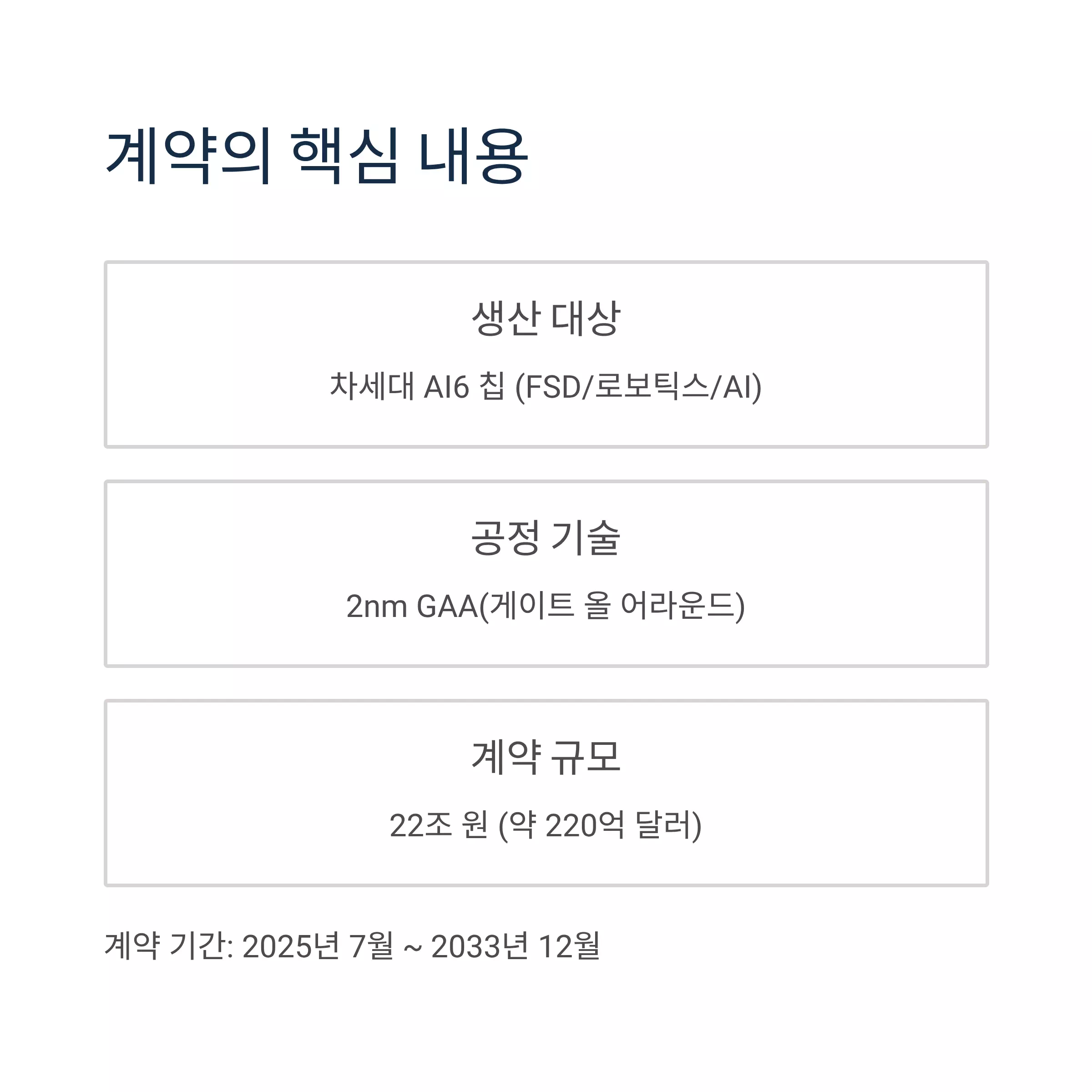 2025년 7월, 삼성전자가 테슬라와 22조 원(약 220억 달러) 규모의 초대형 파운드리 계약을 체결했습니다.