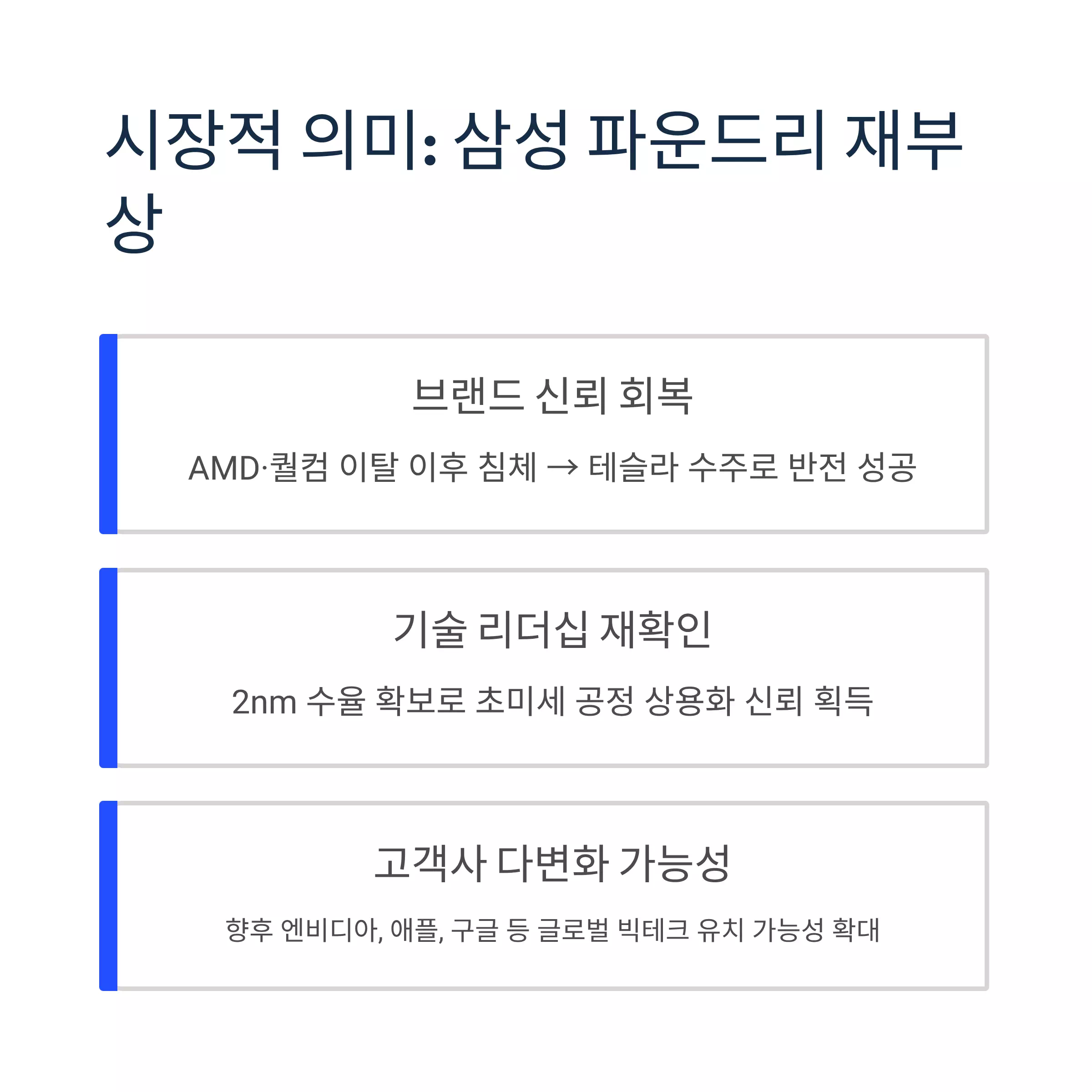 | 브랜드 신뢰 회복 | AMD·퀄컴 이탈 이후 침체 → 테슬라 수주로 반전 성공 |