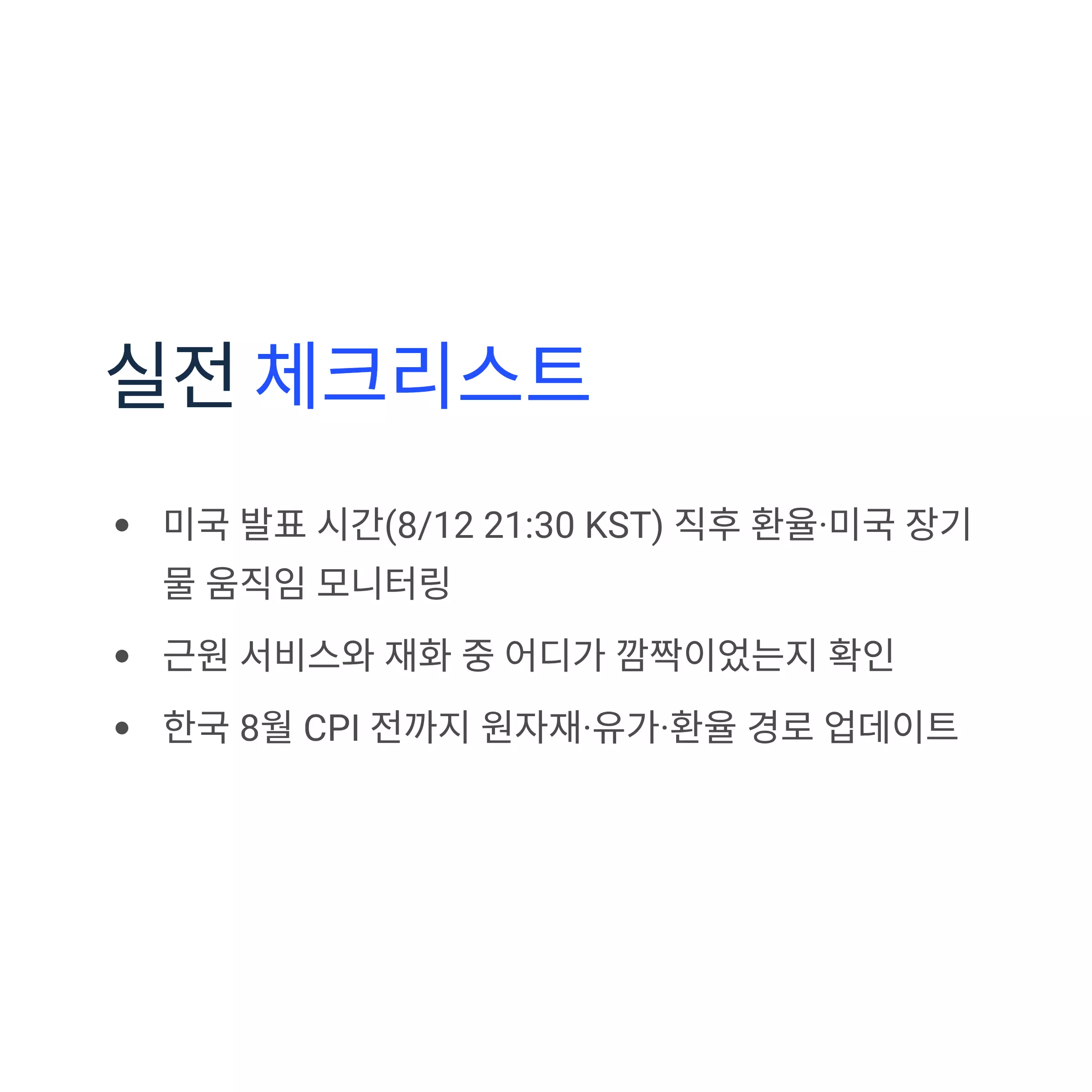 - 미국 발표 시간(8/12 21:30 KST) 직후 환율·미국 장기물 움직임 모니터링