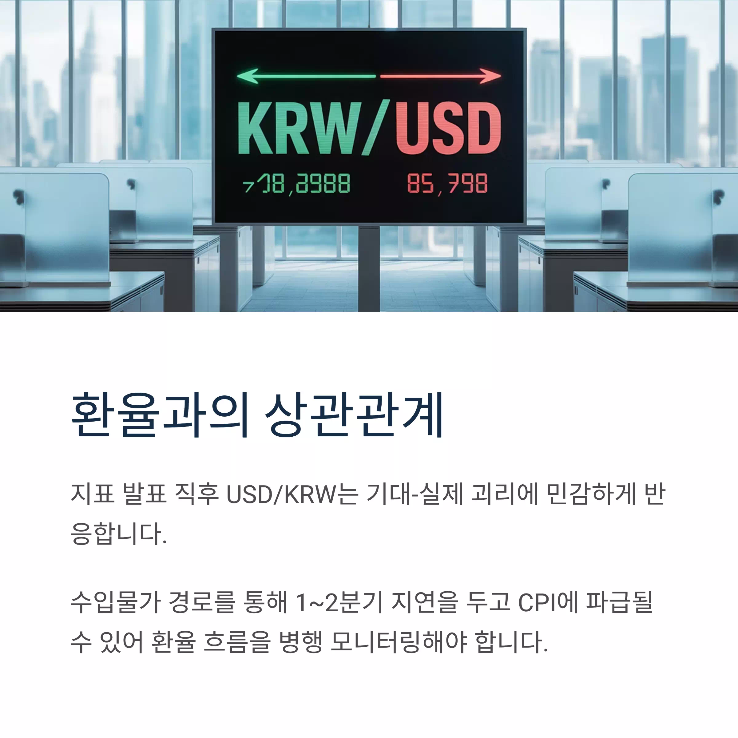 지표 발표 직후 USD/KRW는 기대-실제 괴리에 민감하게 반응합니다. 수입물가 경로를 통해 1~2분기 지연을 두고 CPI에 파급될 수 있어 환율 흐름을 병행 모니터링해야 합니다.