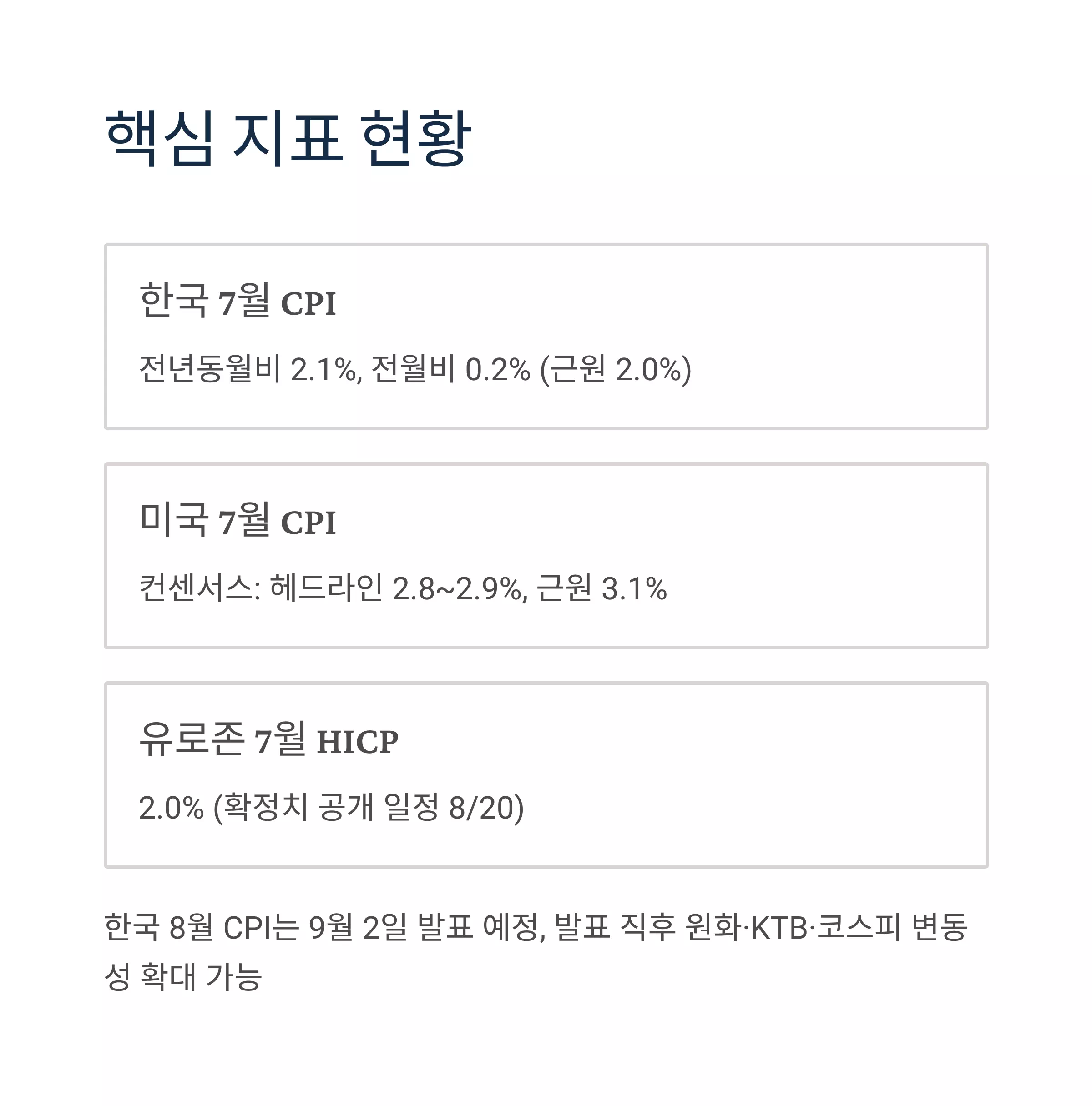 - 한국 8월 CPI 발표 일정: 9/2(화) 예정. 발표 직후 원화·KTB·코스피 변동성 확대 가능.