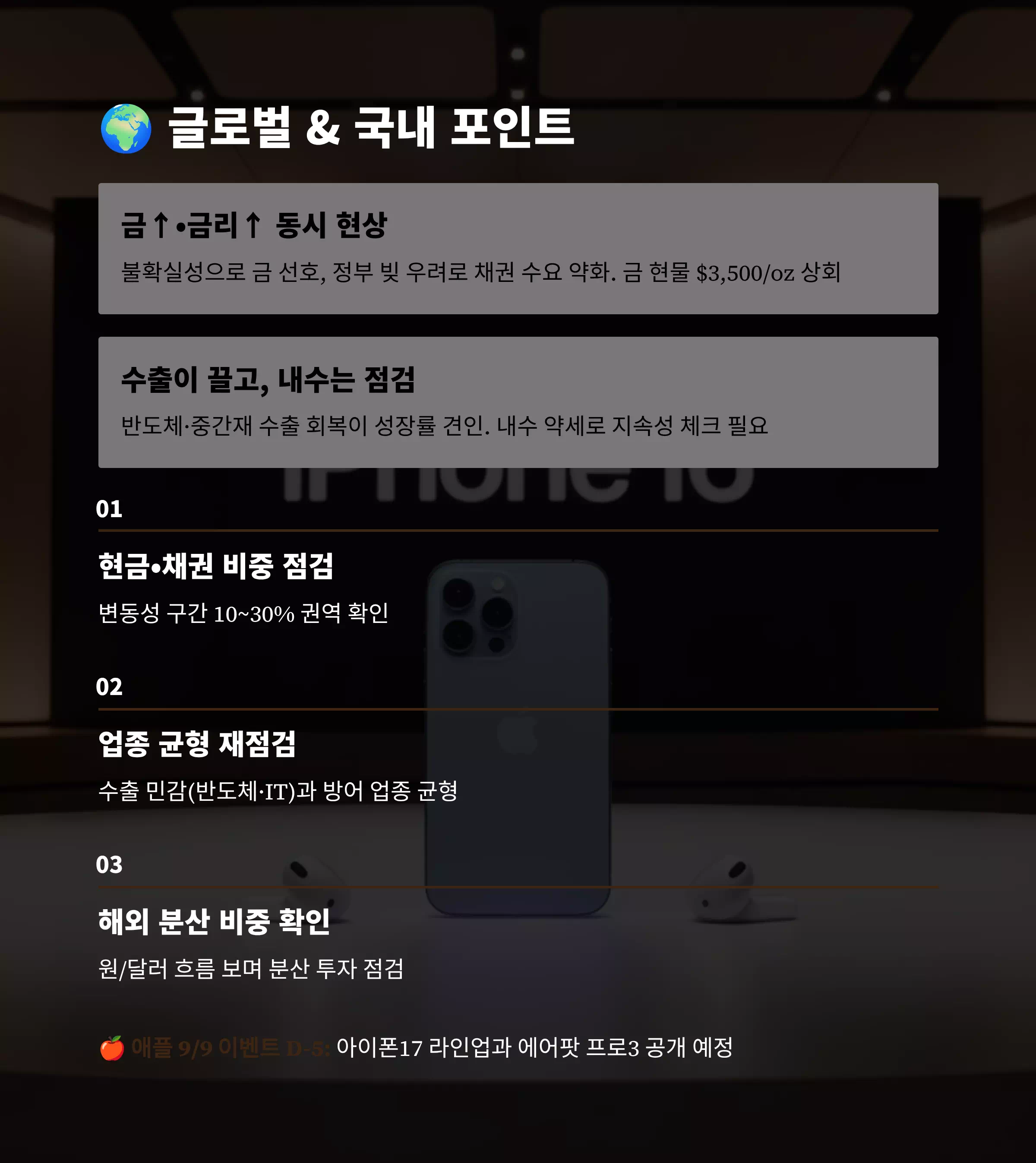 - 원/달러 흐름 보며 해외 분산 비중 확인.