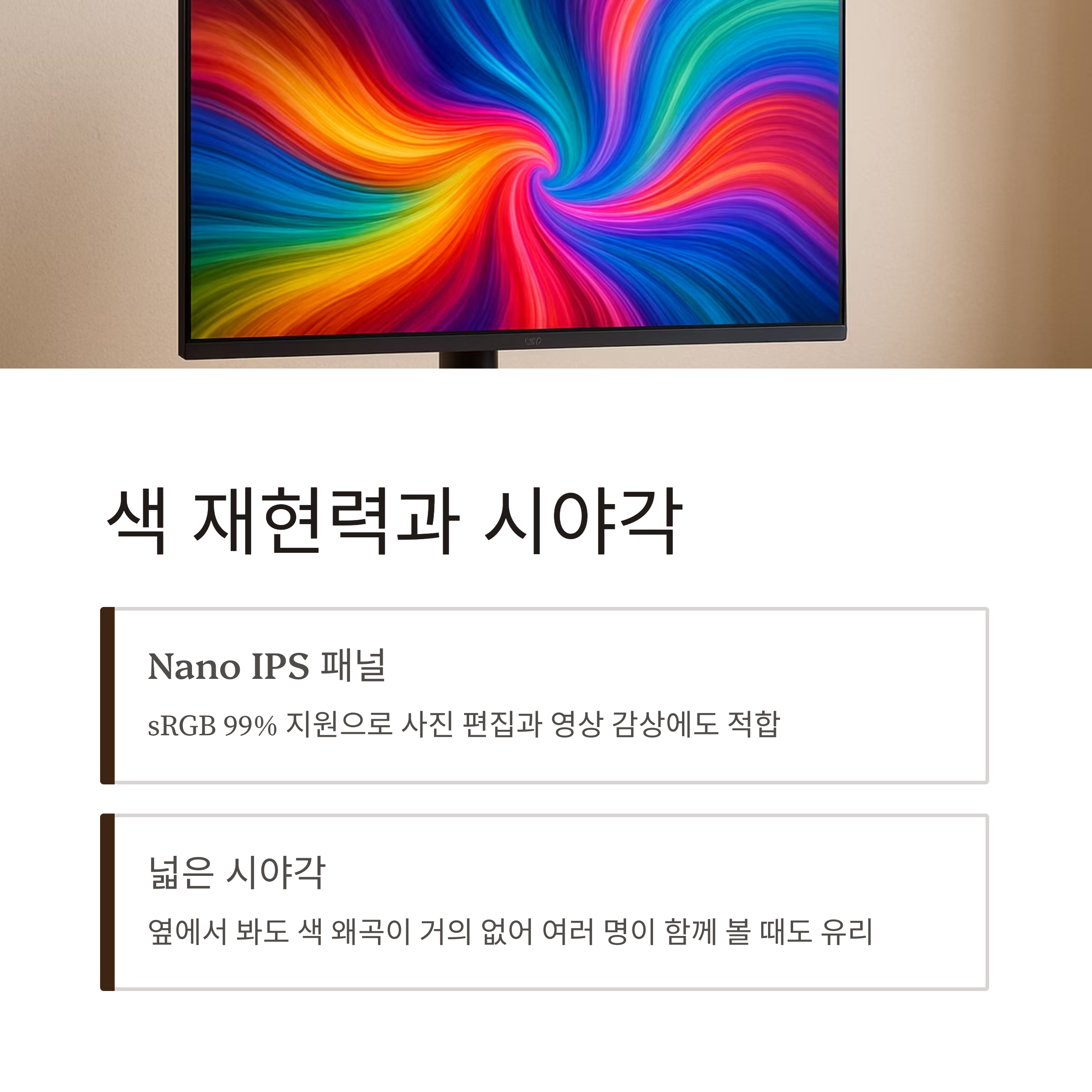 시야각이 넓어 옆에서 봐도 색 왜곡이 거의 없으며,