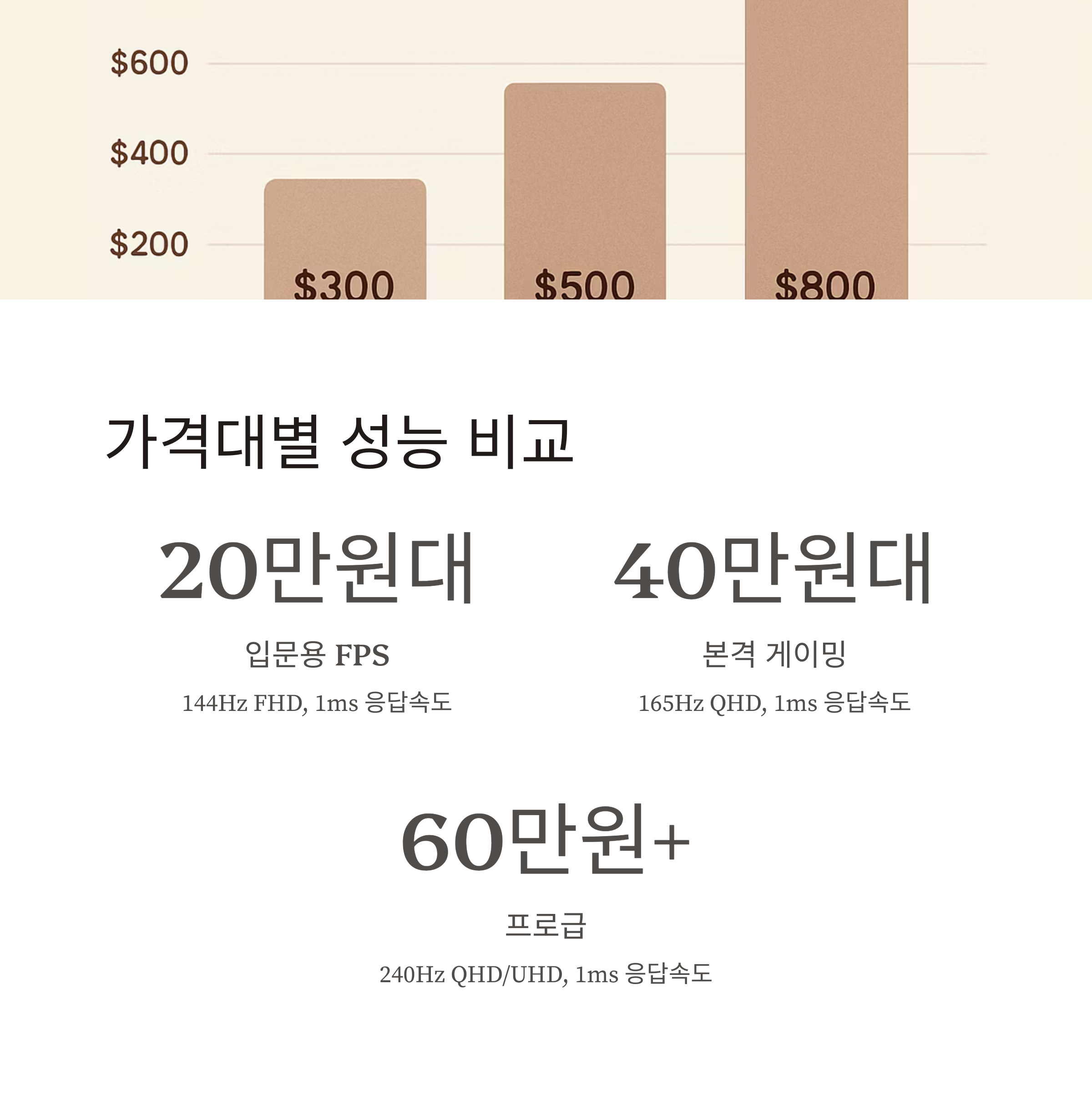 | 60만 원 이상 | 240Hz | QHD/UHD | 1ms | 프로급 게임/작업용 |