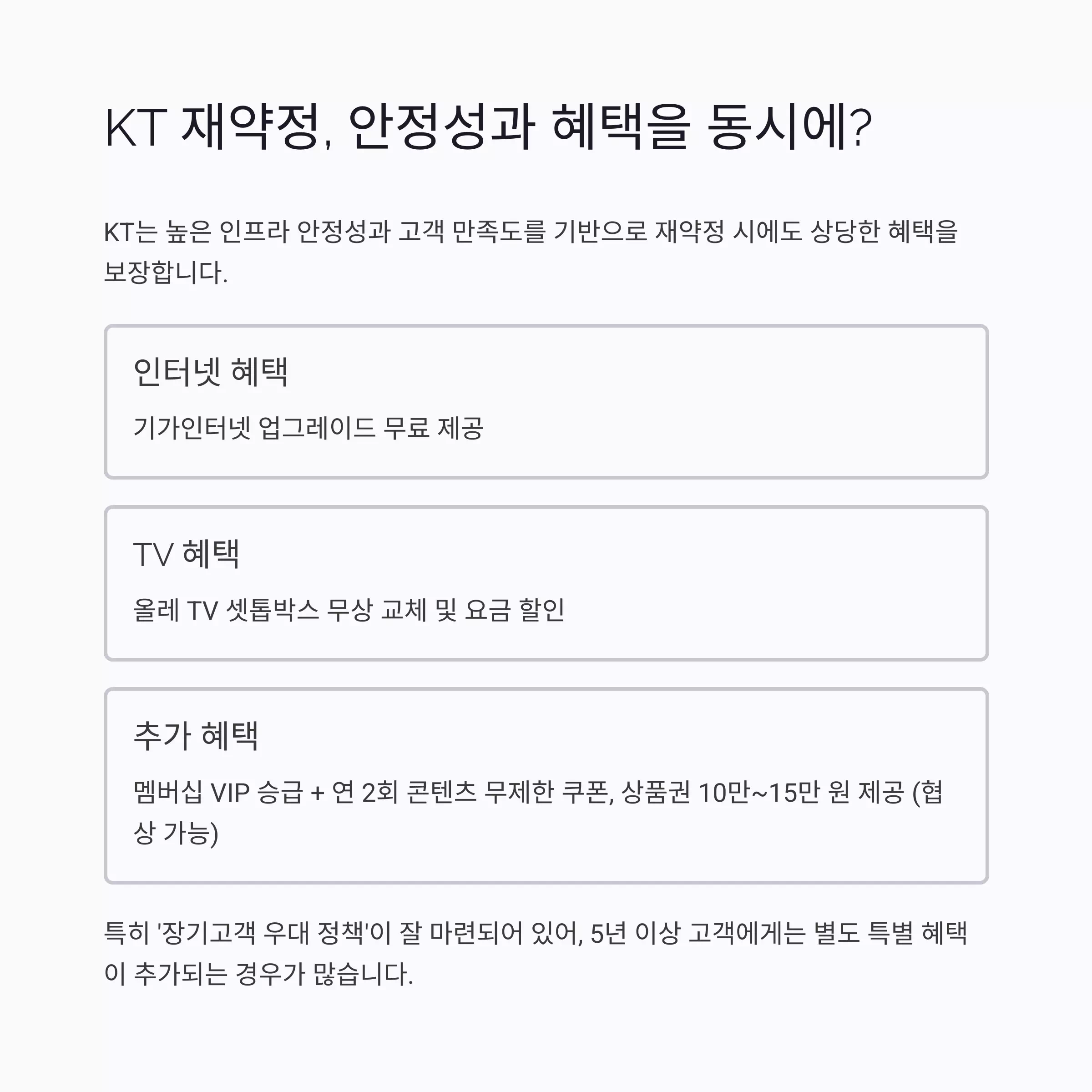 KT는 여전히 높은 인프라 안정성과 고객 만족도를 기반으로 재약정 시에도 상당한 혜택을 보장하는 편입니다.