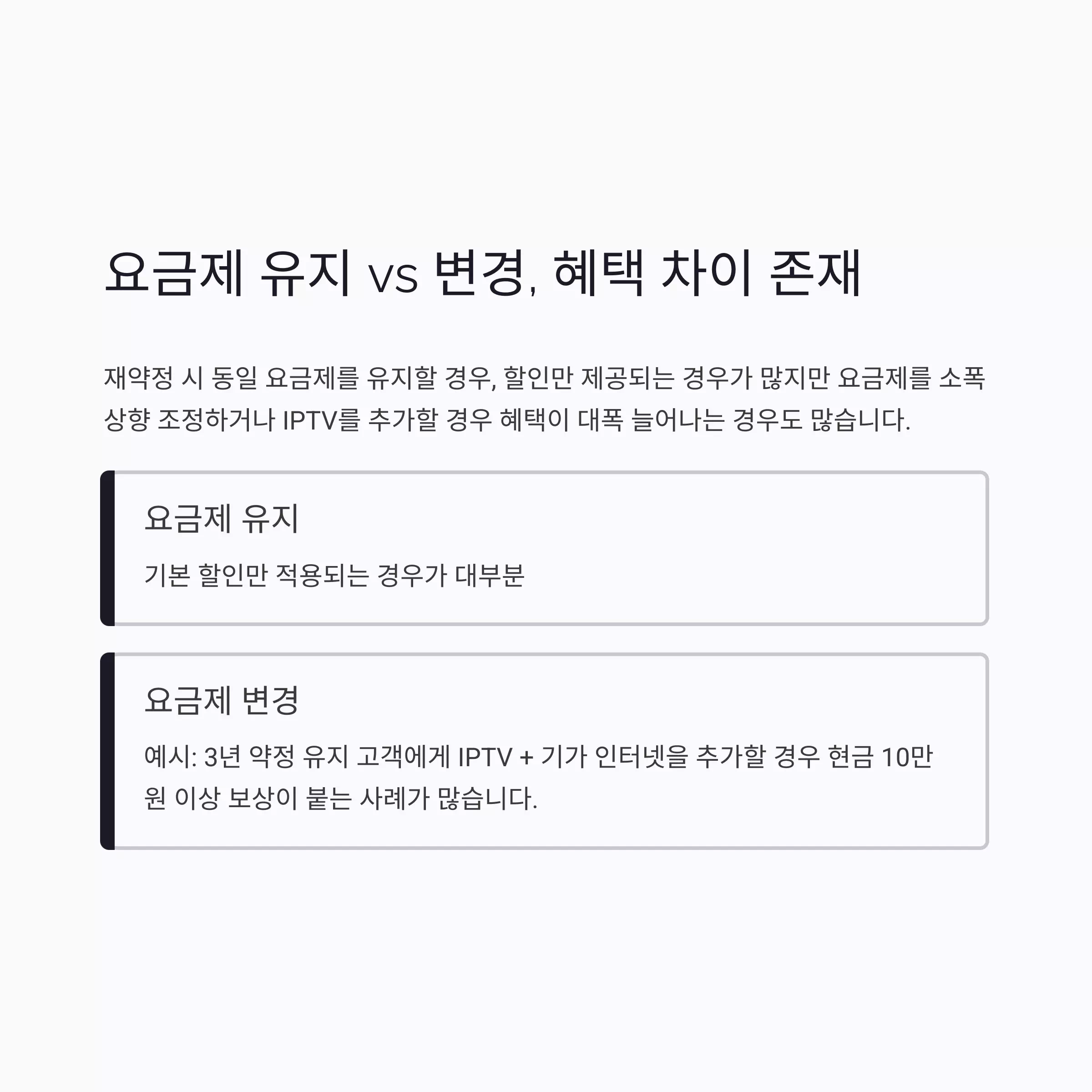 재약정 시 동일 요금제를 유지할 경우, 할인만 제공되는 경우가 많지만 요금제를 소폭 상향 조정하거나 IPTV를 추가할 경우 혜택이 대폭 늘어나는 경우도 많습니다.