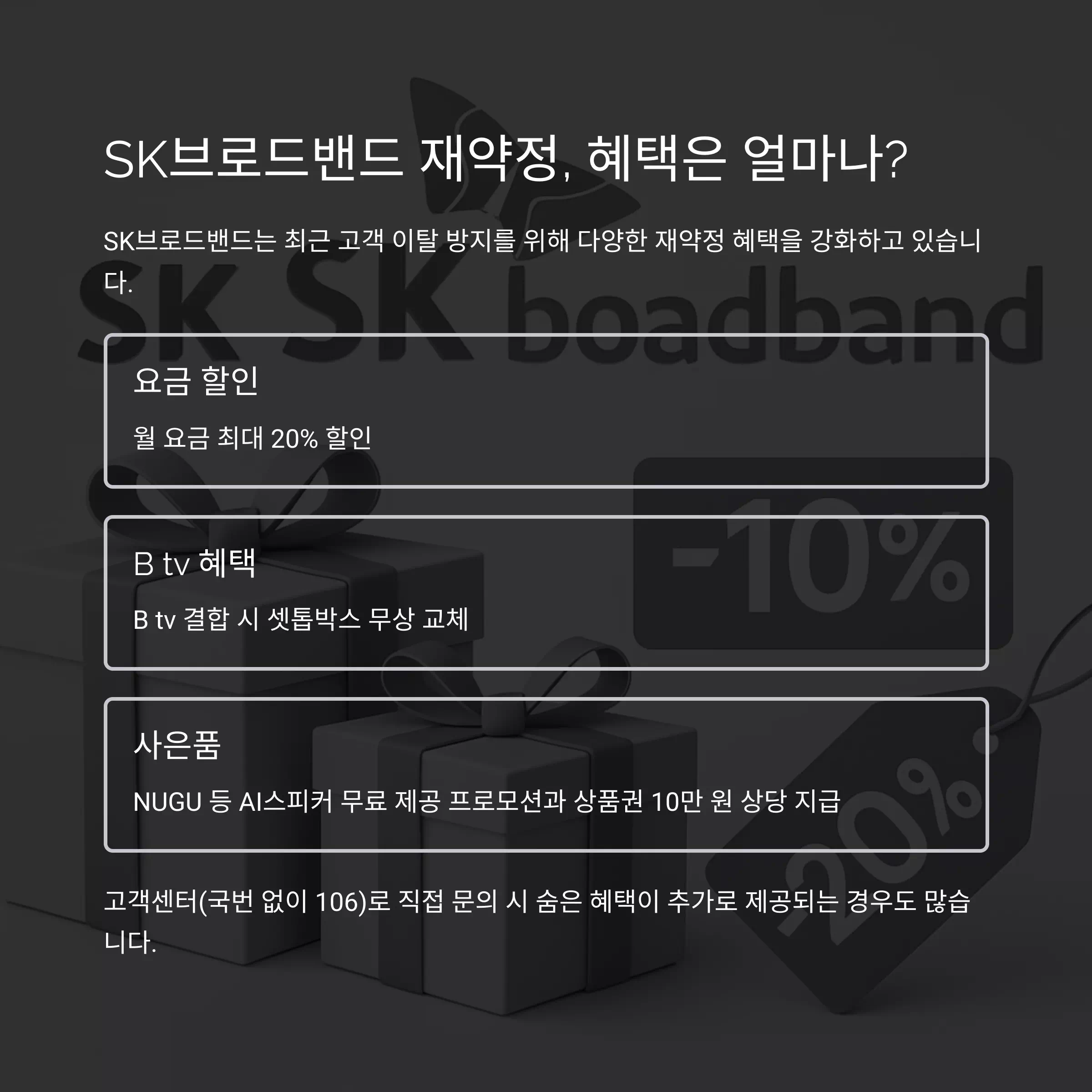 | SK브로드밴드 | 최대 20% | Btv AI스피커 등 | 약 10만 원 |