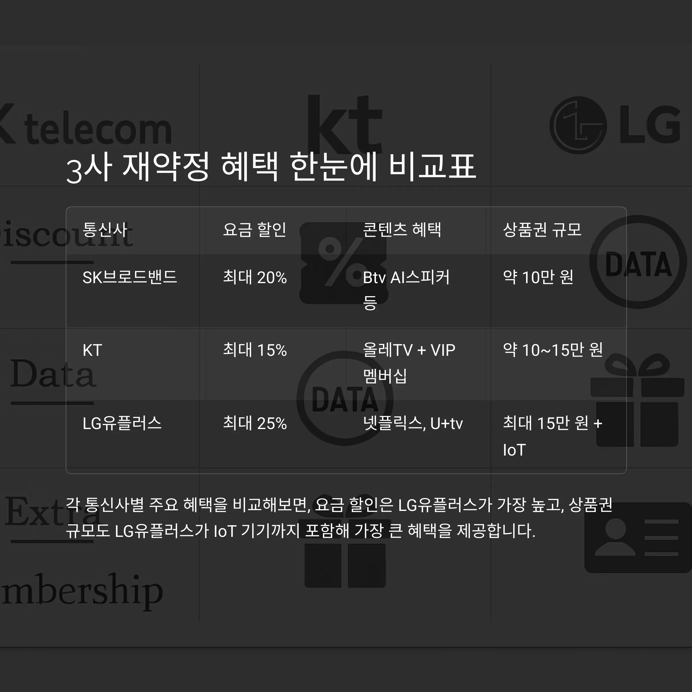 | 통신사 | 요금 할인 | 콘텐츠 혜택 | 상품권 규모 |